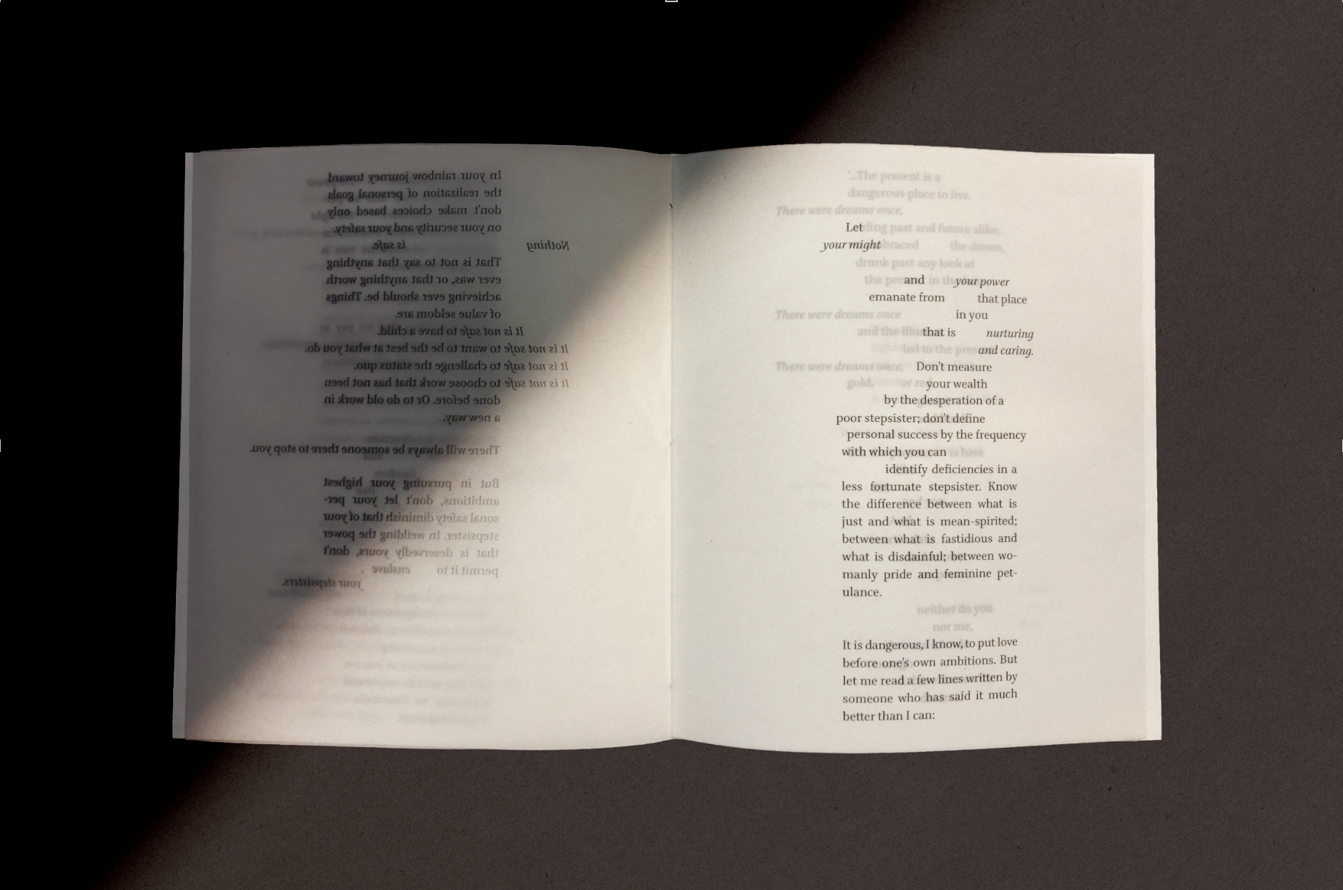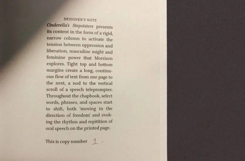 Cinderella’s StepsistersChapbook Design EDITION OF 2 5.5 X 6.85 IN 35 PAGES Cinderella’s Stepsisters is the 1979 Barnard College commencement speech delivered by Toni Morrison. This hand-bound chapbook invites us to consider the enduring resonance of her words, over 40 years later. Slide 1 Slide 1 (current slide) Slide 2 Slide 2 (current slide) Slide 3 Slide 3 (current slide) Slide 4 Slide 4 (current slide) Slide 5 Slide 5 (current slide) Slide 6 Slide 6 (current slide) Slide 7 Slide 7 (current slide) Slide 8 Slide 8 (current slide) Slide 9 Slide 9 (current slide) Slide 10 Slide 10 (current slide)